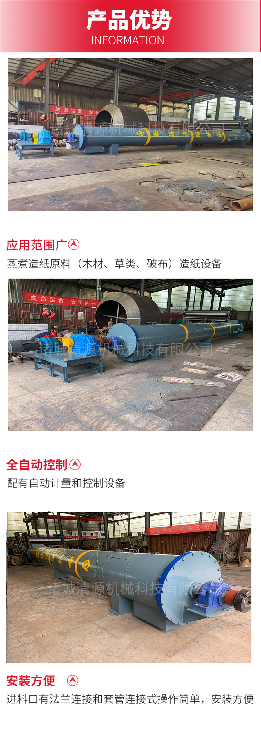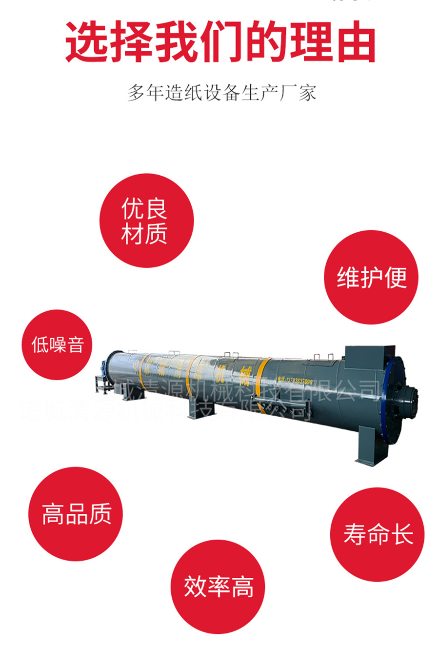 諸城清源機械科技有限公司生產的螺旋蒸煮器用以蒸煮造紙原料(如木材、草類、破布等),使與蒸煮液起化學作用而得到主要為纖維素的紙漿。